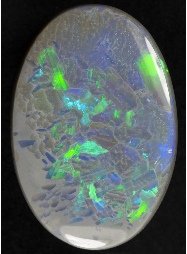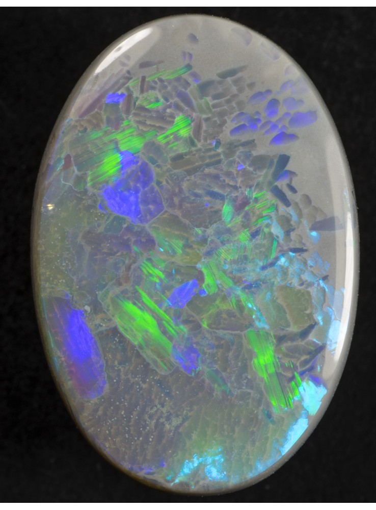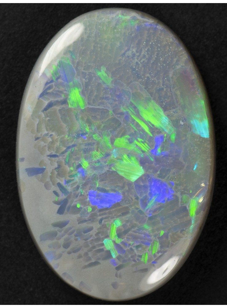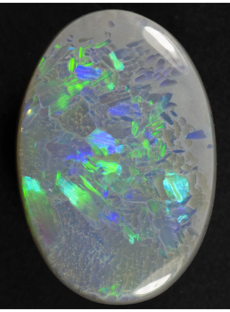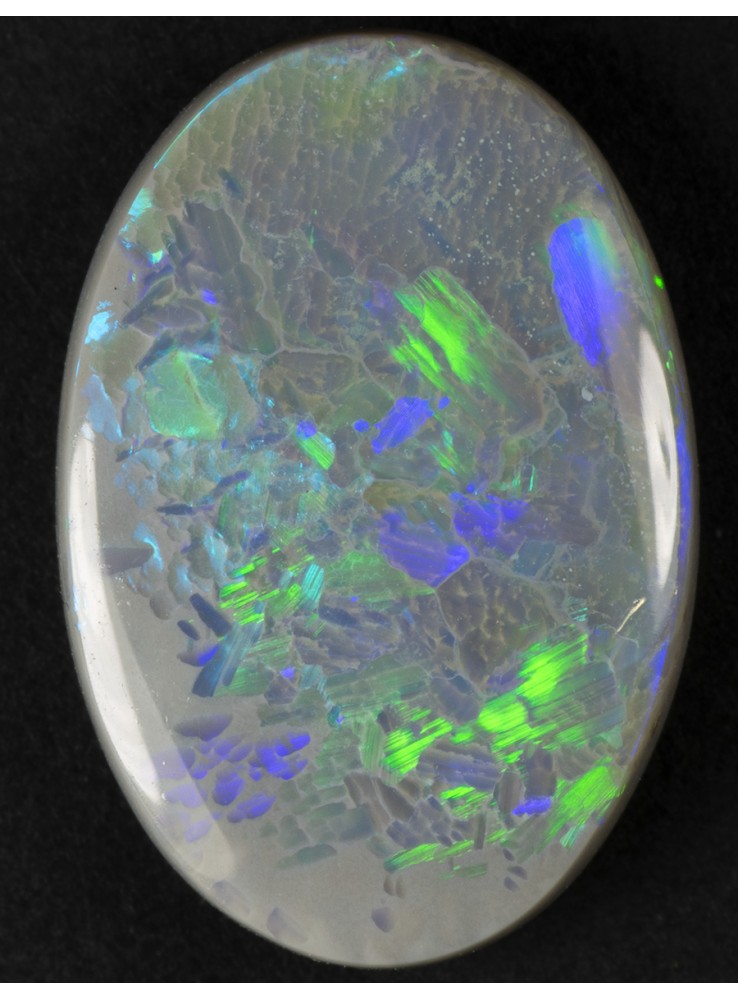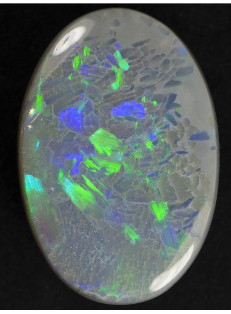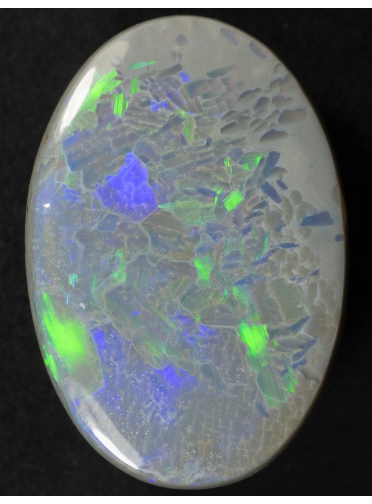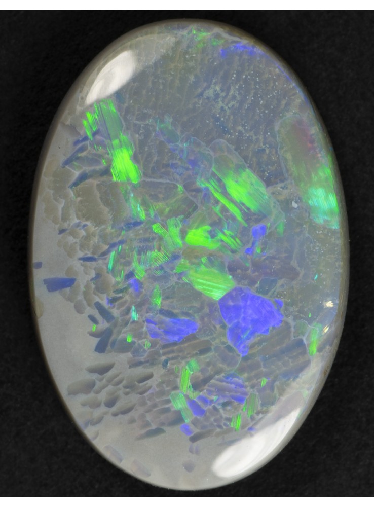 Přírodní drahý opál z Austrálie (Lightning Ridge). Nádherná kombinace barvoměny a vnitřních inkluzí. Zářivá zelená barva dokonale probleskuje mezi inkluzemi a krásná modrá barva vše doplňuje v pozadí opálu. 13,4x9,2x3mm, 2,42ct