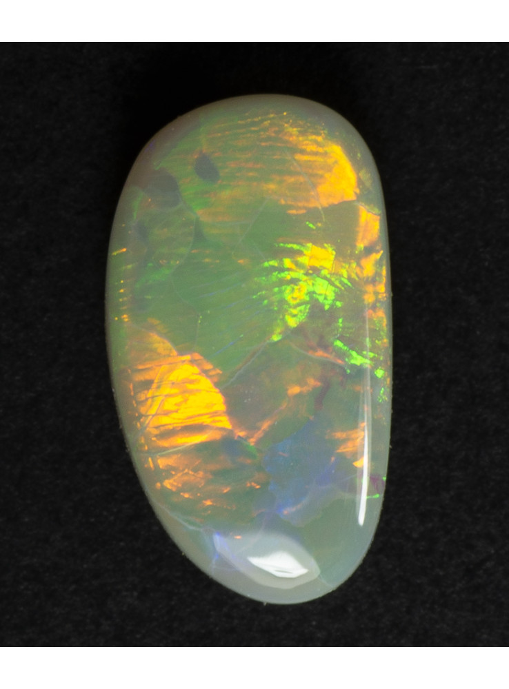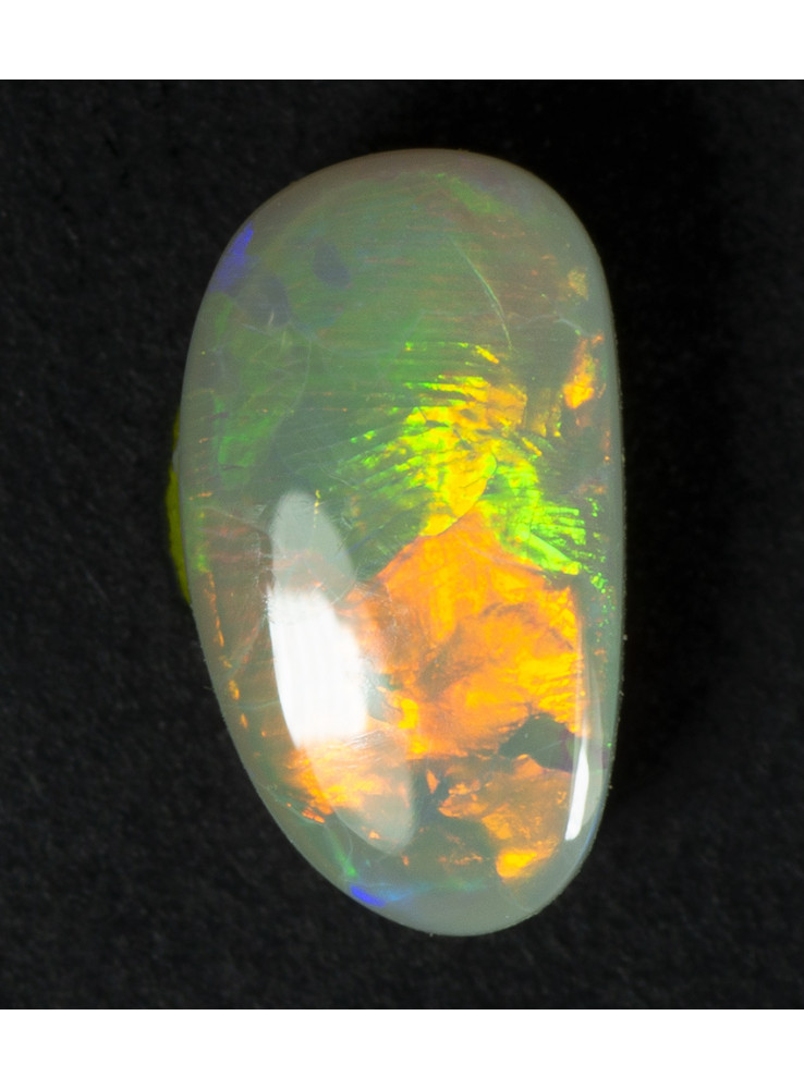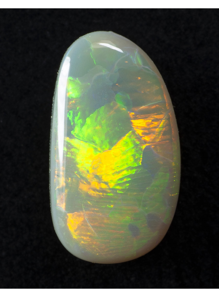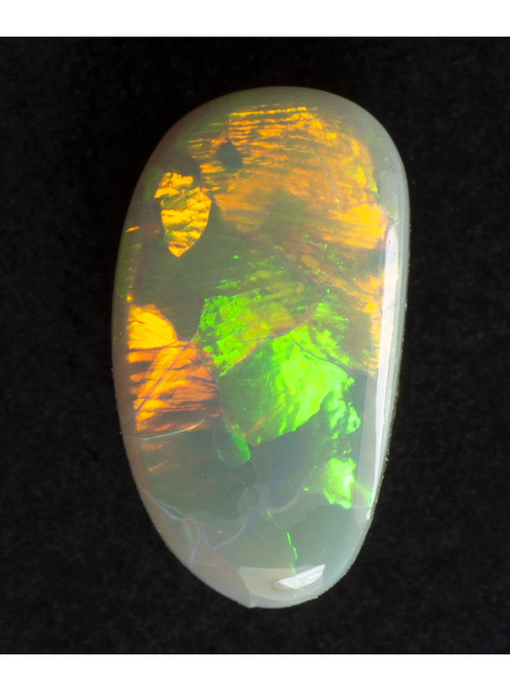 Přírodní drahý opál z Austrálie (Lightning Ridge). Pod slabším osvětlením je opál zcela oranžový. Pod vyšší intenzitou osvětlení, se oranžová přeměňuje na zcela žlutou barvu, která se zároveň střídá se zelenou barvou v zajímavém vzoru. Vzácná barvoměna ve vysoké brilanci. 7,6x4,3x2,8mm, 0,62ct