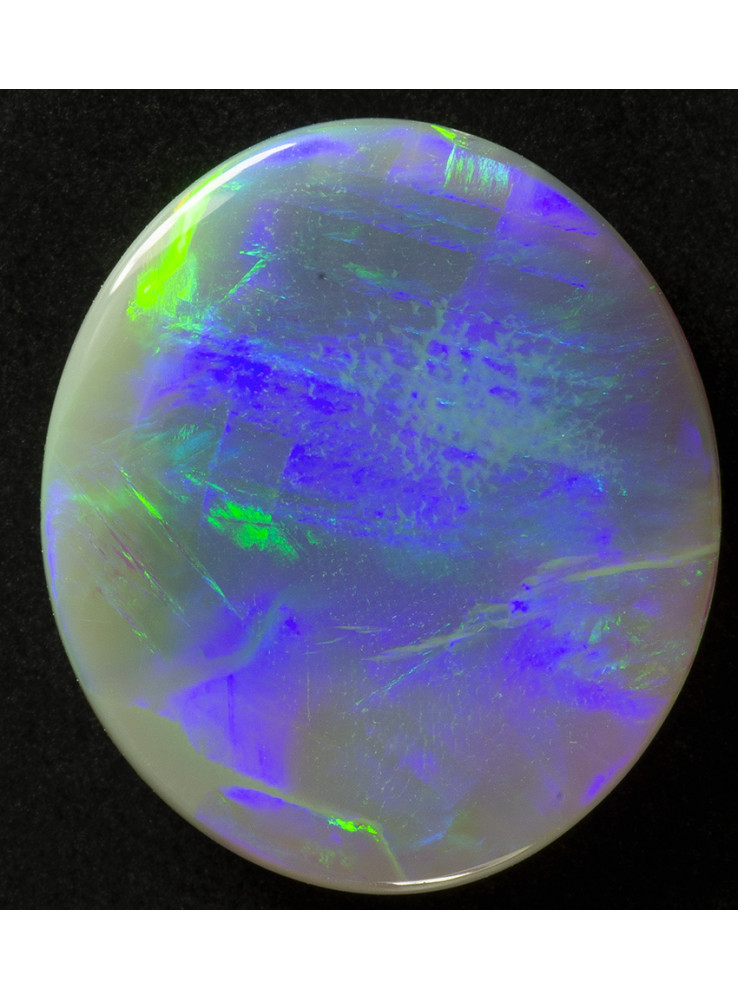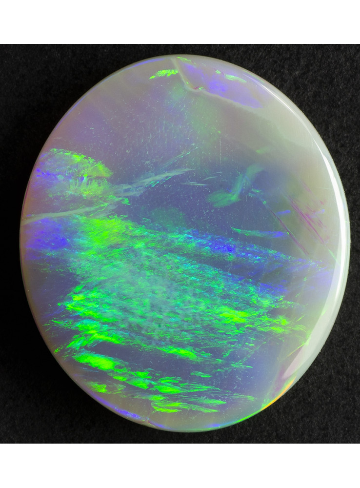 Přírodní drahý opál z Austrálie (Lightning Ridge). Nádherný opál se vzácným Iris vzorem, zelená a modrá barva jsou uspořádány v paprscích, při pohybu opálu se objevují jednotlivé barevné vzory. 12x10,1x2,1mm, 2,53ct