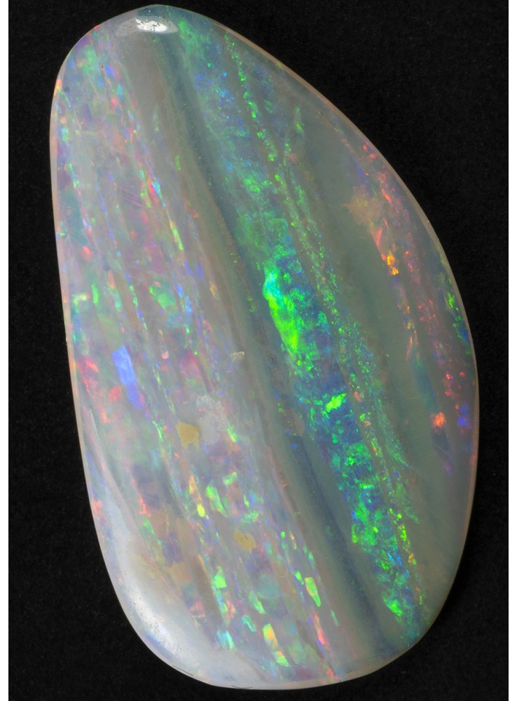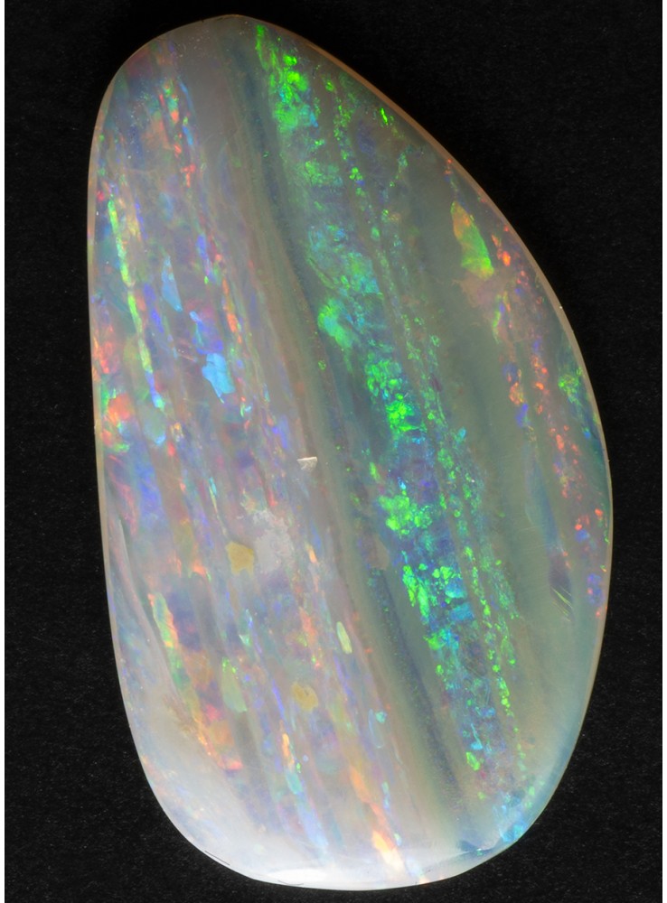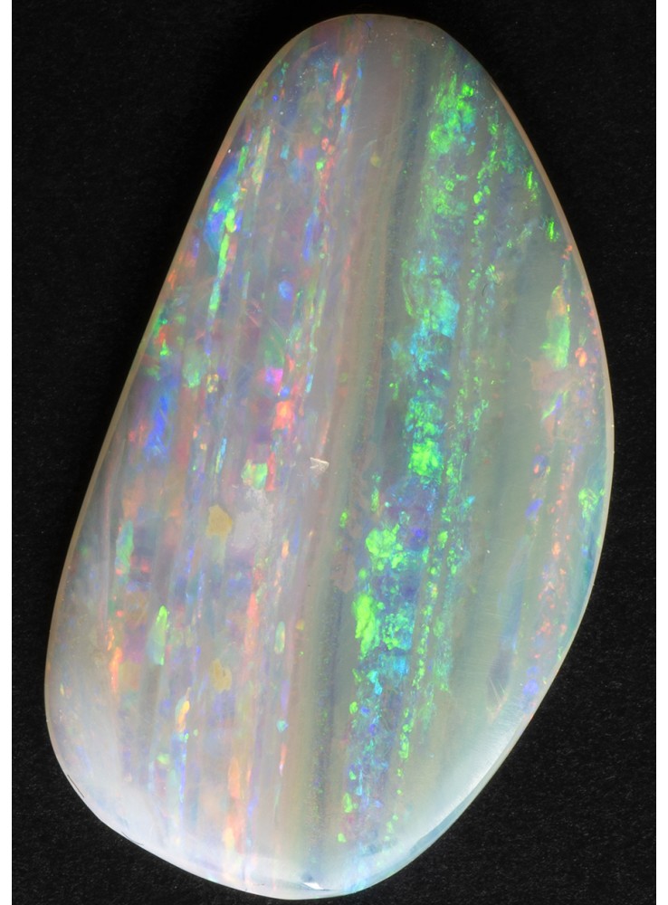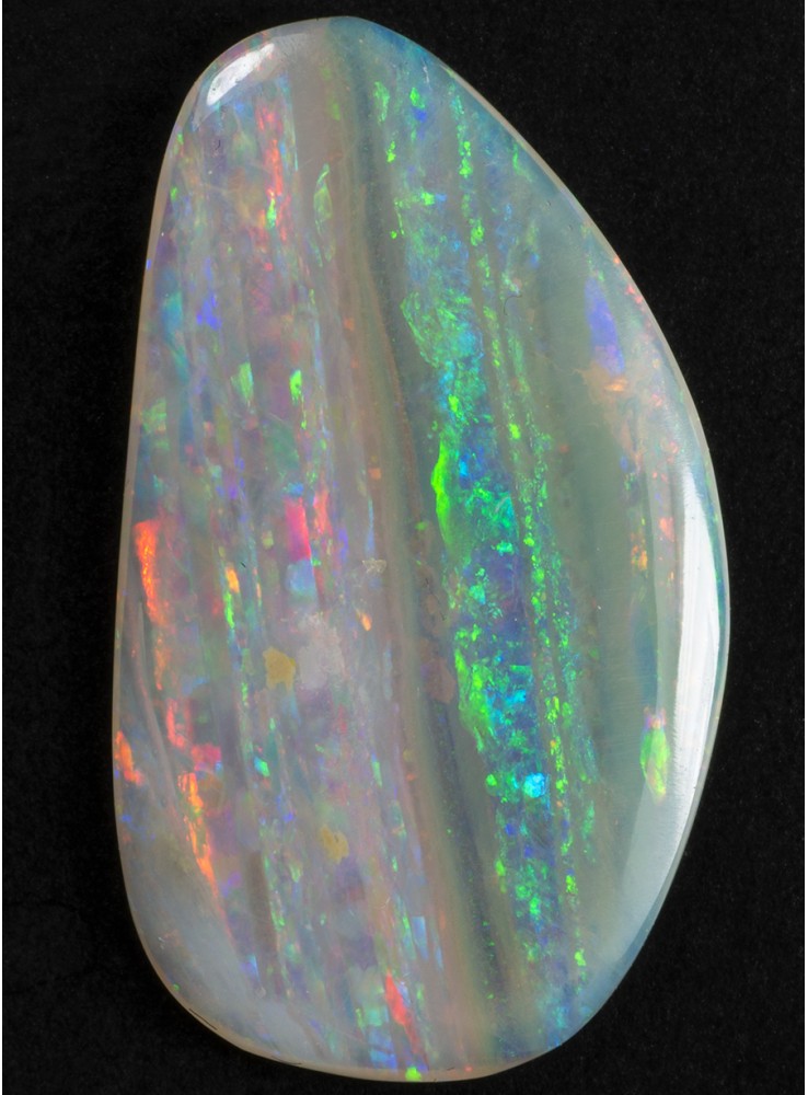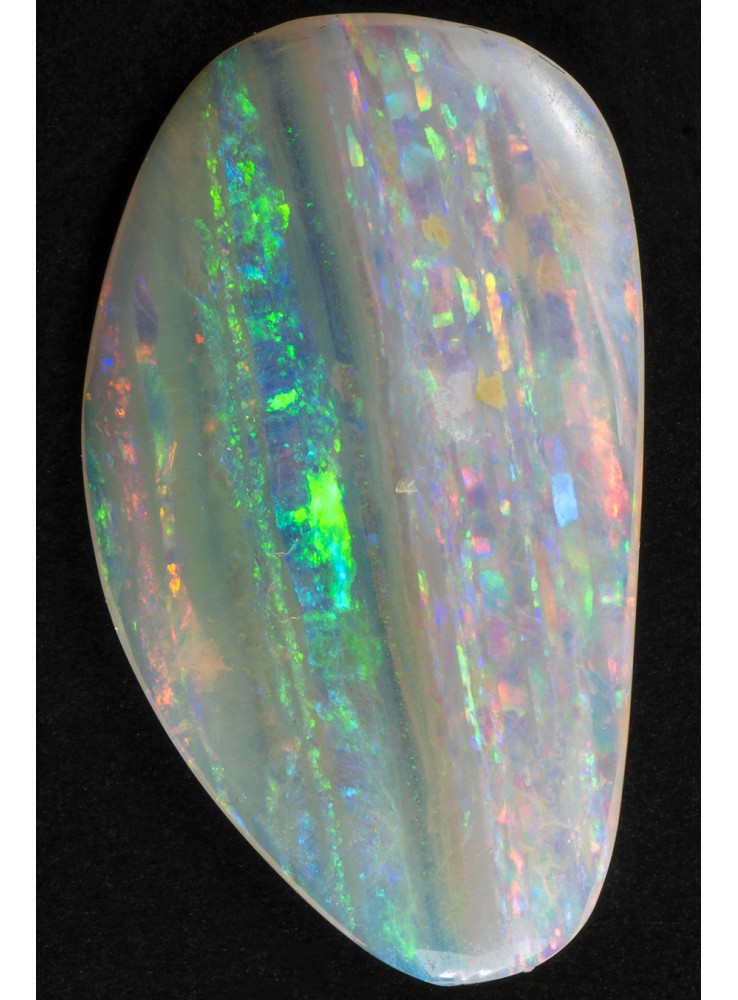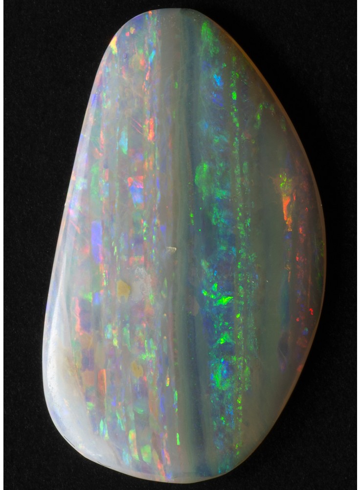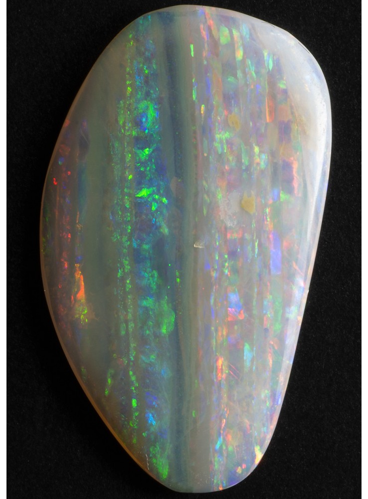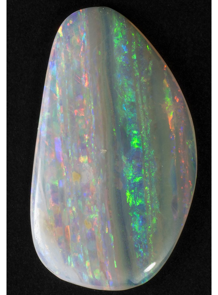Přírodní drahý opál z Austrálie (Lightning Ridge). Nádherný opál s unikátním Mackerel Sky vzorem, všechny barvy uspořádané v pestrých pruzích. V každém pruhu se zobrazuje jiná barva. Tenký plátek drahého opálu plných vzácných barev a vzorů. 18,3x10,5x1,6mm, 2,01ct