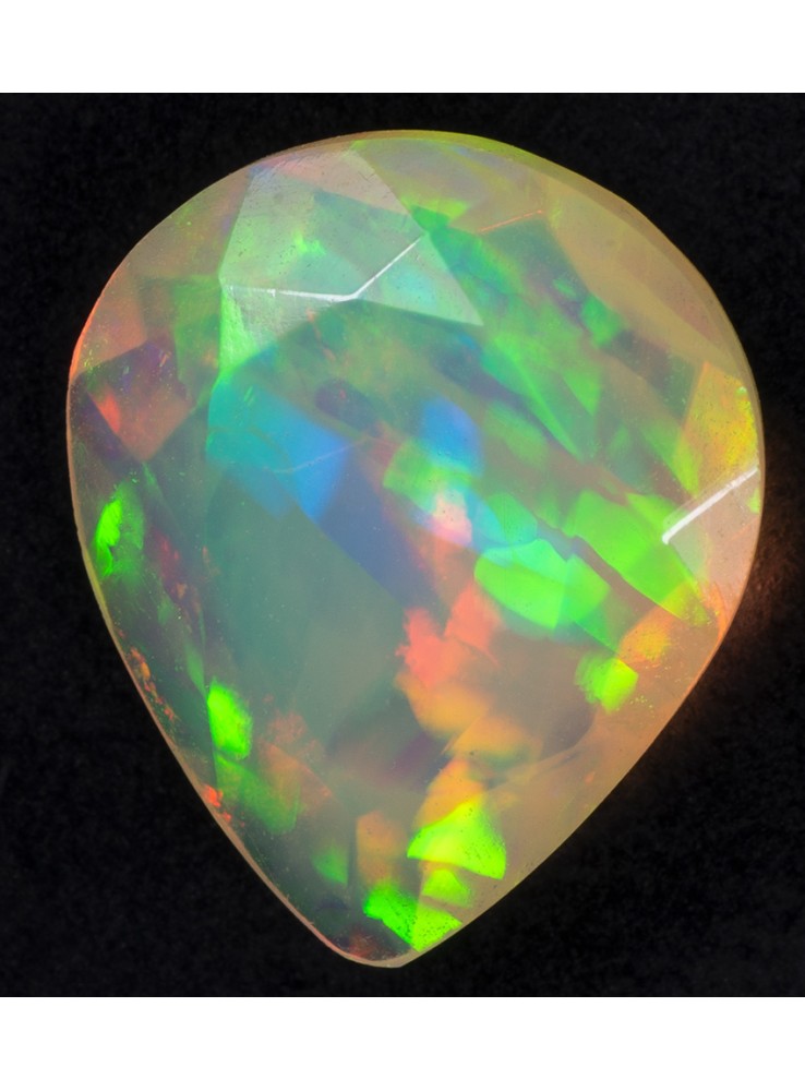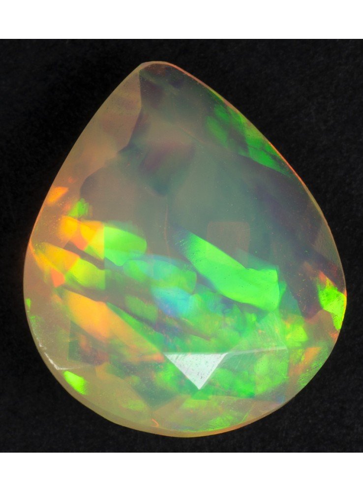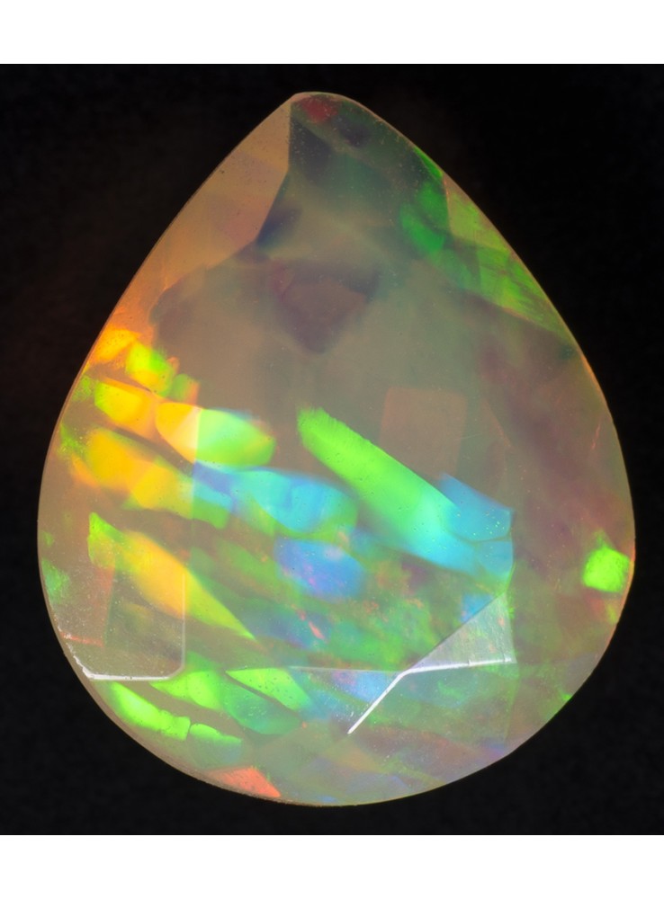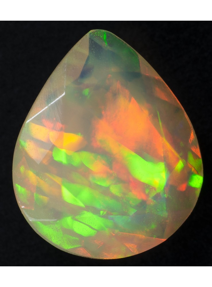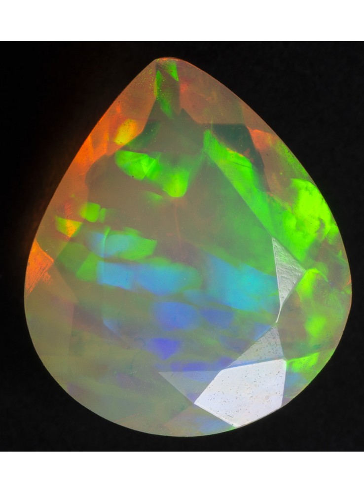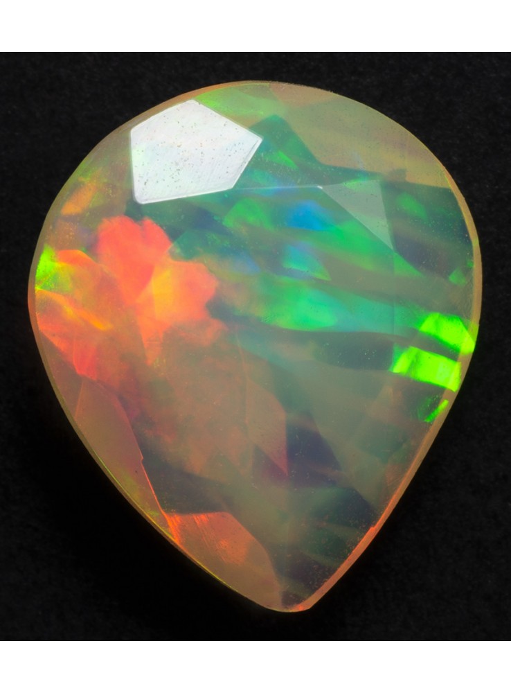 Přírodní drahý opál z Etiopie (Wello). Fasetový výbrus. Pestré a výrazné barvy v zajímavých vzorech. Ve spodní části opálu pestré odstíny barev, které se krásně zobrazují ve vnitřních inkluzích a v horní části výrazná červená a oranžová barva, které se střídá se zářivou zelenou barvou. 11x9,5x4,2mm, 1,66ct