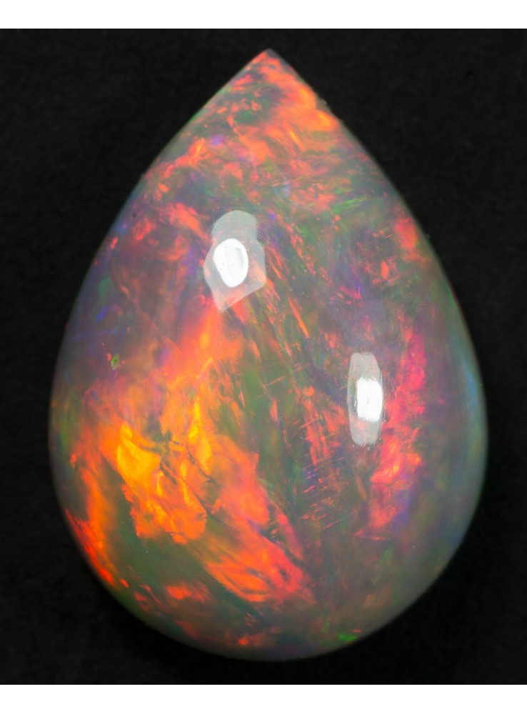 Přírodní drahý opál z Etiopie (Wello). Dominantní červená s oranžovou barvou v krásném vzoru po celém opálu. V pozadí se hezky zobrazuje modrá barva se zelenou. 14x10,1x5,7mm, 3,76ct