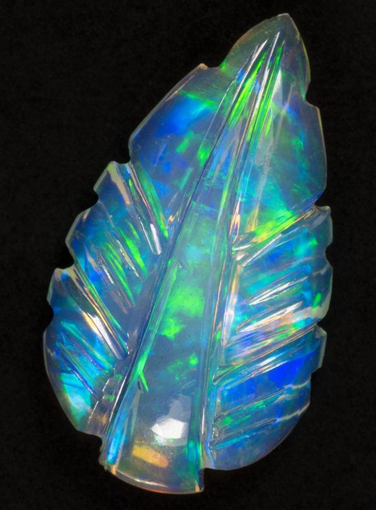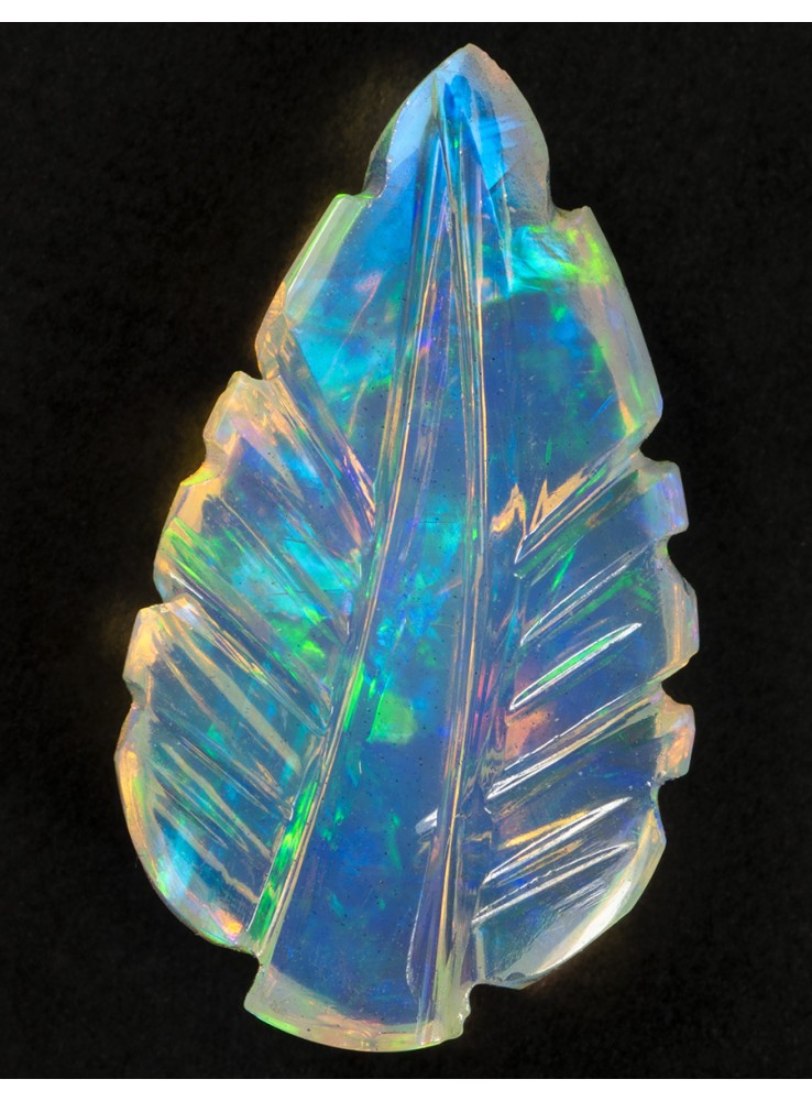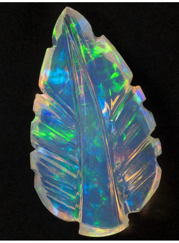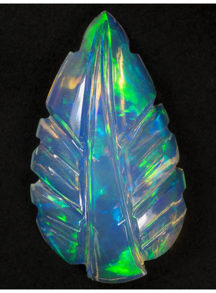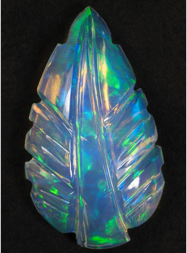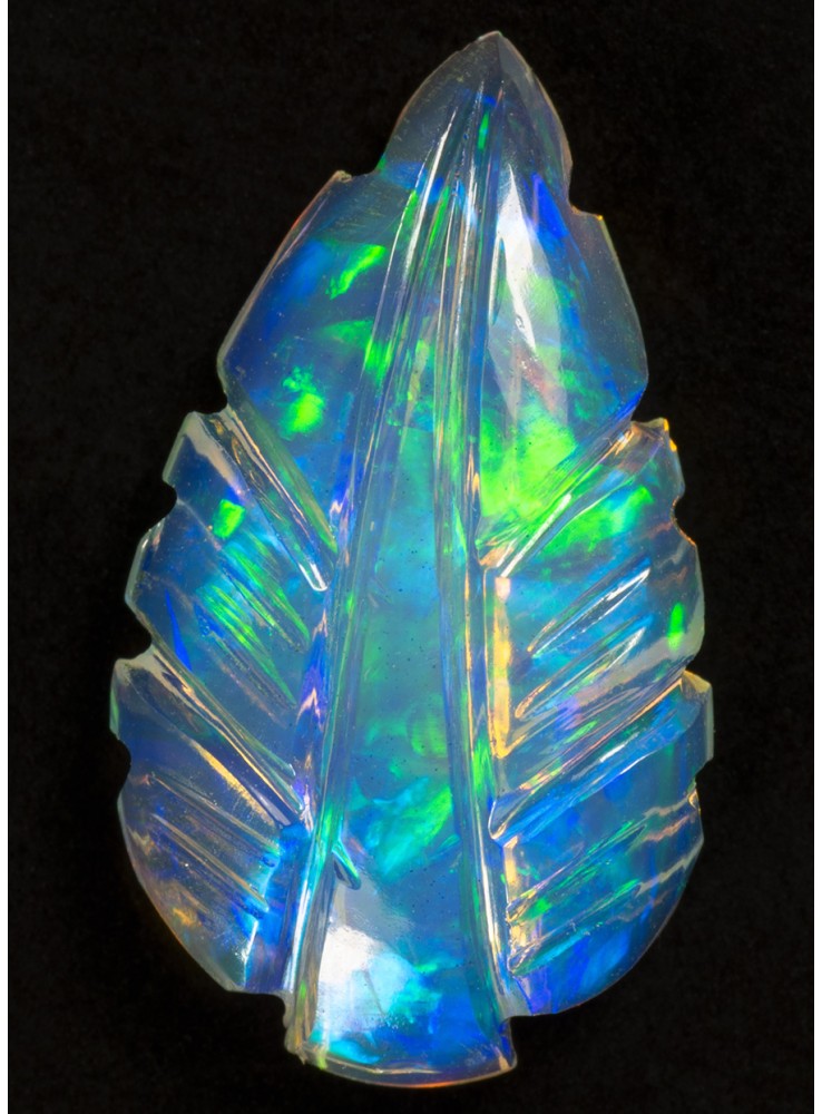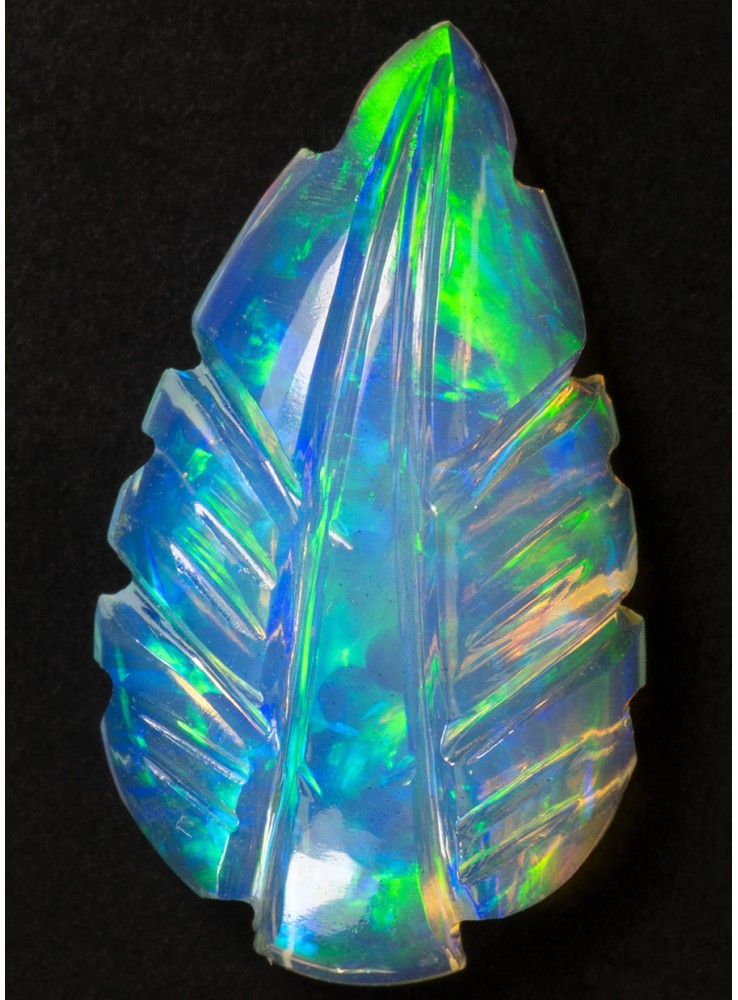 Přírodní drahý opál z Etiopie. Carving. Ručně vyřezávaný opál v podobě listu. Nádherné barvy zelené a modré jsou krásně výrazné z obou stran opálu. 17x10x4mm, 2,82ct