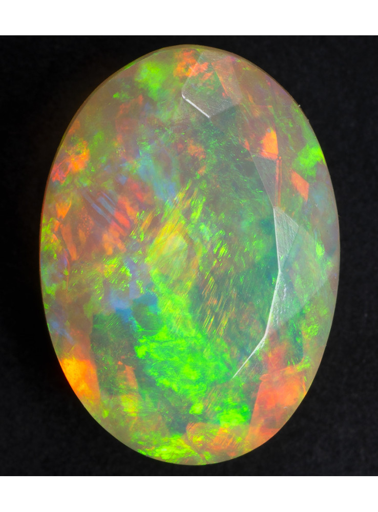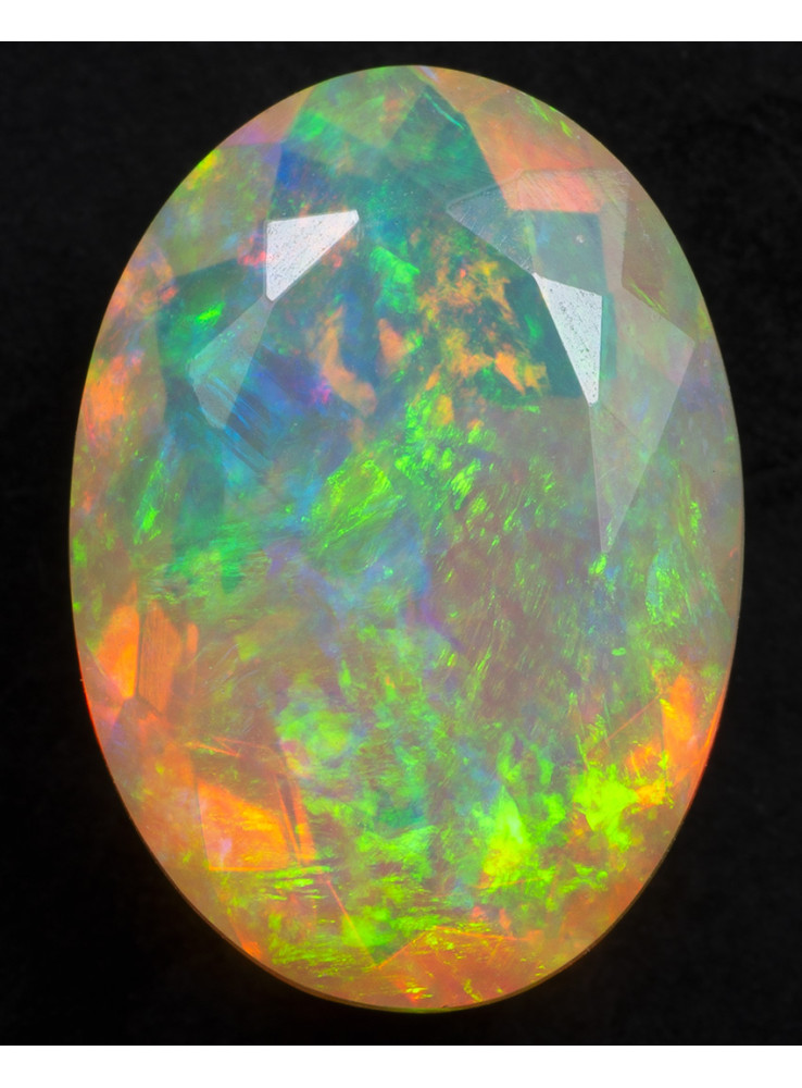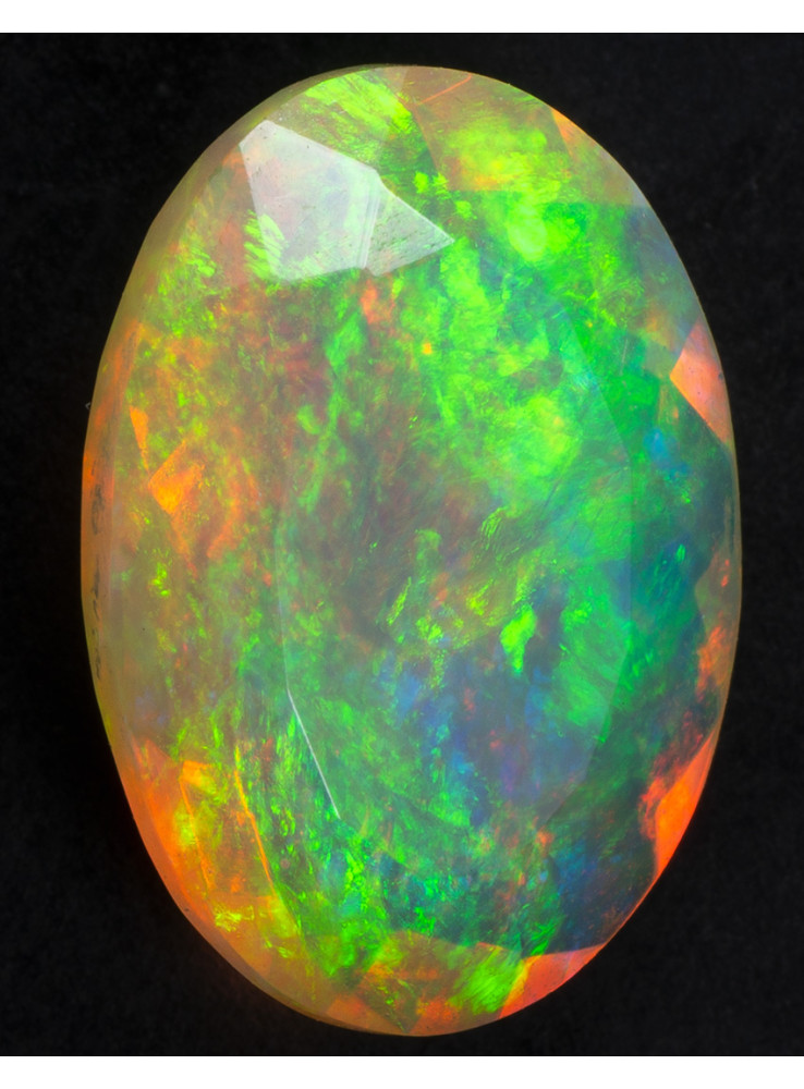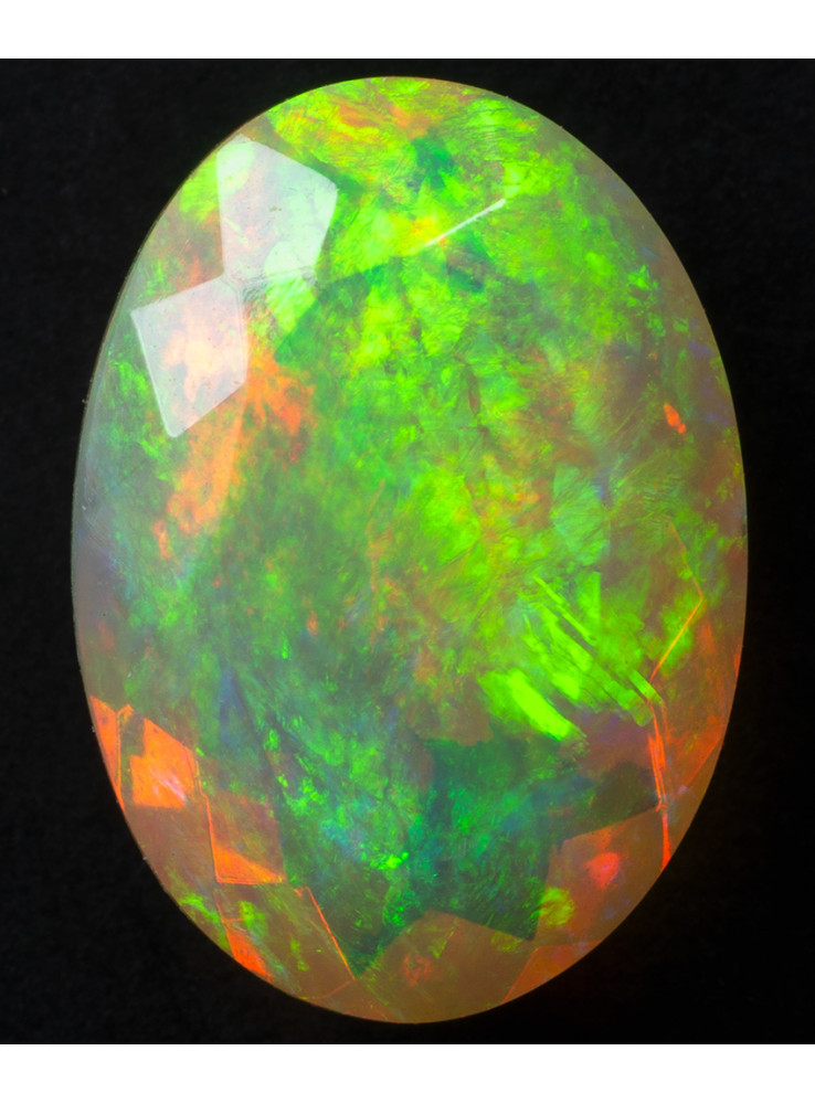 Drahý opál z Etiopie - Welo. Fasetový výbrus. Převládající zářivá zelená barva v krásném vzoru, jakoby se prala s odstíny oranžové a žluté barvy, o své místo v opálu. Vše krásně doplňují ostatní pestré barvy v pozadí. Netradiční směs barev. 13,4x9,5x5,6mm, 3ct